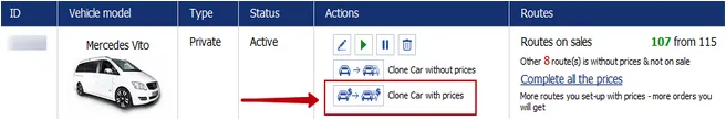 - If you have a big Fleet of cars of different models & brands, on the basis of the already added vehicle with routes you can create (clone) a new vehicle, just by clicking on the “Clone the vehicle with prices” button:
