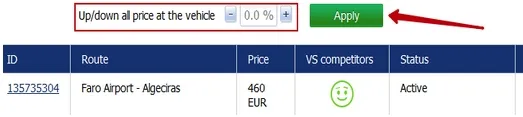 4.1. If it is important to edit your prices for ALL the routes, just click on the “Up/down all prices at the vehicle” and add more OR less percentage: